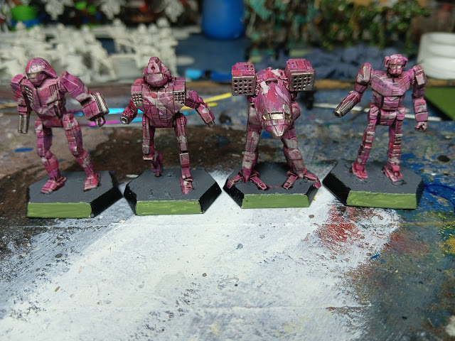 Now the Colour Cube cards have been fun, but certain colour combinations were presenting more and more of a challenge (see the "pink" unit below). So I kept with the cards but rather than applying the colours to a single mech, I decided to apply to a whole lance.